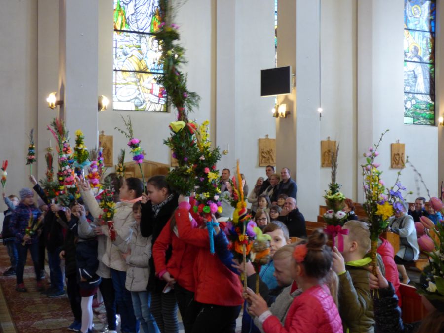 Uroczyste poświęcenie palm miało miejsce w przed Mszą św. o godz. 10.00. Wszyscy zebrani przy Krzyżu Misyjnym przed kościołem wysłuchali fragmentu Ewangelii według św. Mateusza mówiącej o uroczystym wjeździe Jezusa do Jerozolimy. Następnie rozpoczęła się procesja z palmami wokół kościoła.
