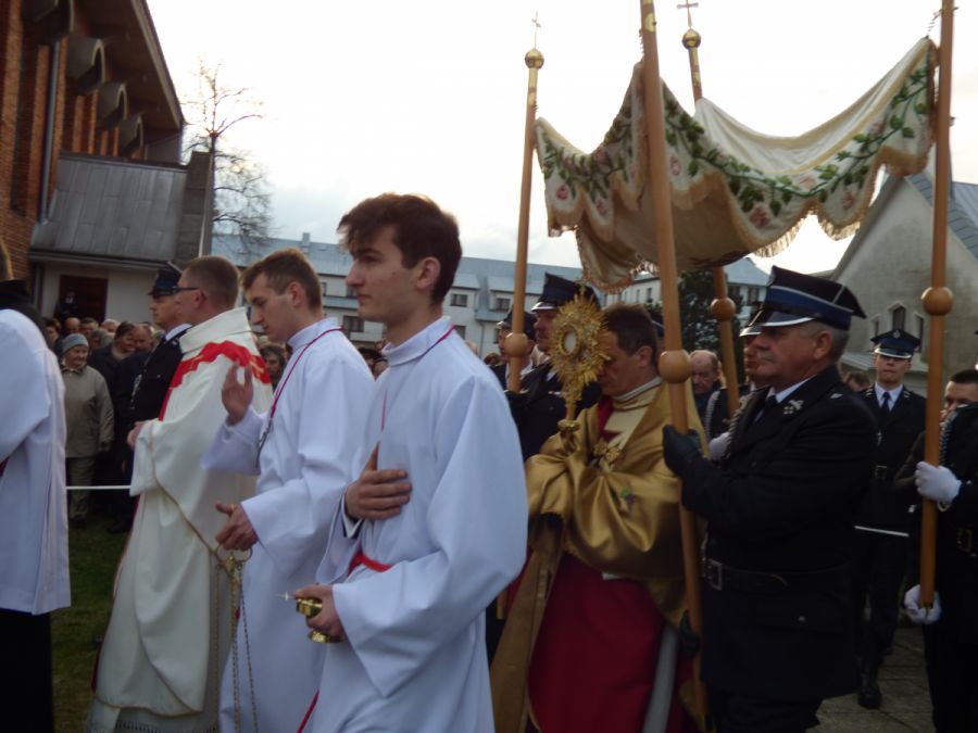 W poranek wielkanocny, 16 kwietnia 2017 r. bijące dzwony oznajmiły nam, że Chrystus zmartwychwstał! Procesję rezurekcyjną, która tradycyjnie okrążyła kościół trzy razy, poprowadził ks. Proboszcz.
