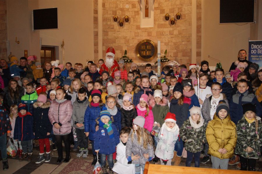 Licznie zgromadzone dzieci od najmłodszych lat, ministranci, schola czekali z utęsknieniem na św. Mikołaja. Przybył On do naszego kościoła i wszedł przez główne drzwi z workiem pełnym cukierków w asyście ministrantów z dzwonkami. Św. Mikołaja wszyscy przywitali gromkimi brawami.